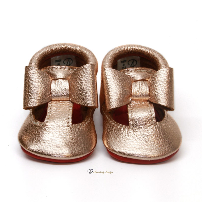 Baby Moccasins Rose Gold Bow Mary Jane baby girl moccasins with bow